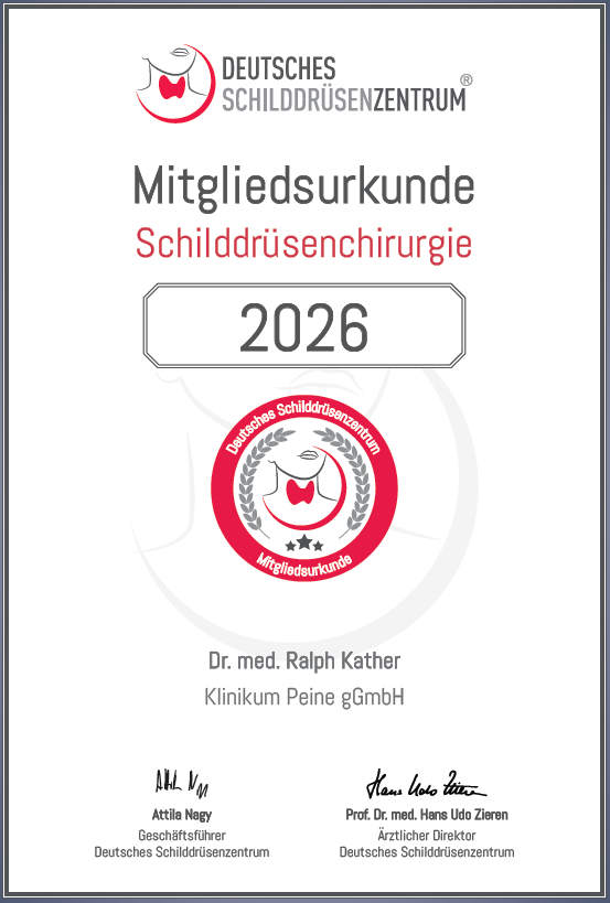 in der Klinik für Allgemein- und Viszeralchirurgie am Klinikum Peine steht ein erfahrenes und engagiertes Team aus Ärztinnen und Ärzten sowie Pflegefachkräften bereit, um sich Ihrem gesundheitlichen Problem anzunehmen. Für die Diagnostik und Behandlung setzen wir neueste Verfahren ein. Die Therapie wird nach modernsten Standards vorgenommen, wobei die meisten Operationen in „Schlüsselloch“-Technik erfolgen. Seit März 2023 sind wir Mitglied im Deutschen Schilddrüsenzentrum. Durch Anklicken des Links werden Sie auf eine externe Seite weitergeleitet