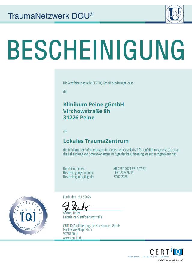 Wir sind als Teil des Traumanetzwerk Nord-Ost-Niedersachsen zur Behandlung Schwerverletzter erfolgreich 2022 rezertifiziert und erfüllen die strengen Anforderungen der Deutschen Gesellschaft für Unfallchirurgie (DGU).