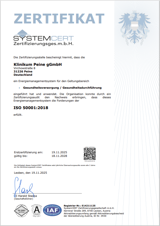 Das Klinikum Peine hat ein Energiemanagementsystem gemäß den Forderungen der ISO 50001:2018 eingeführt.